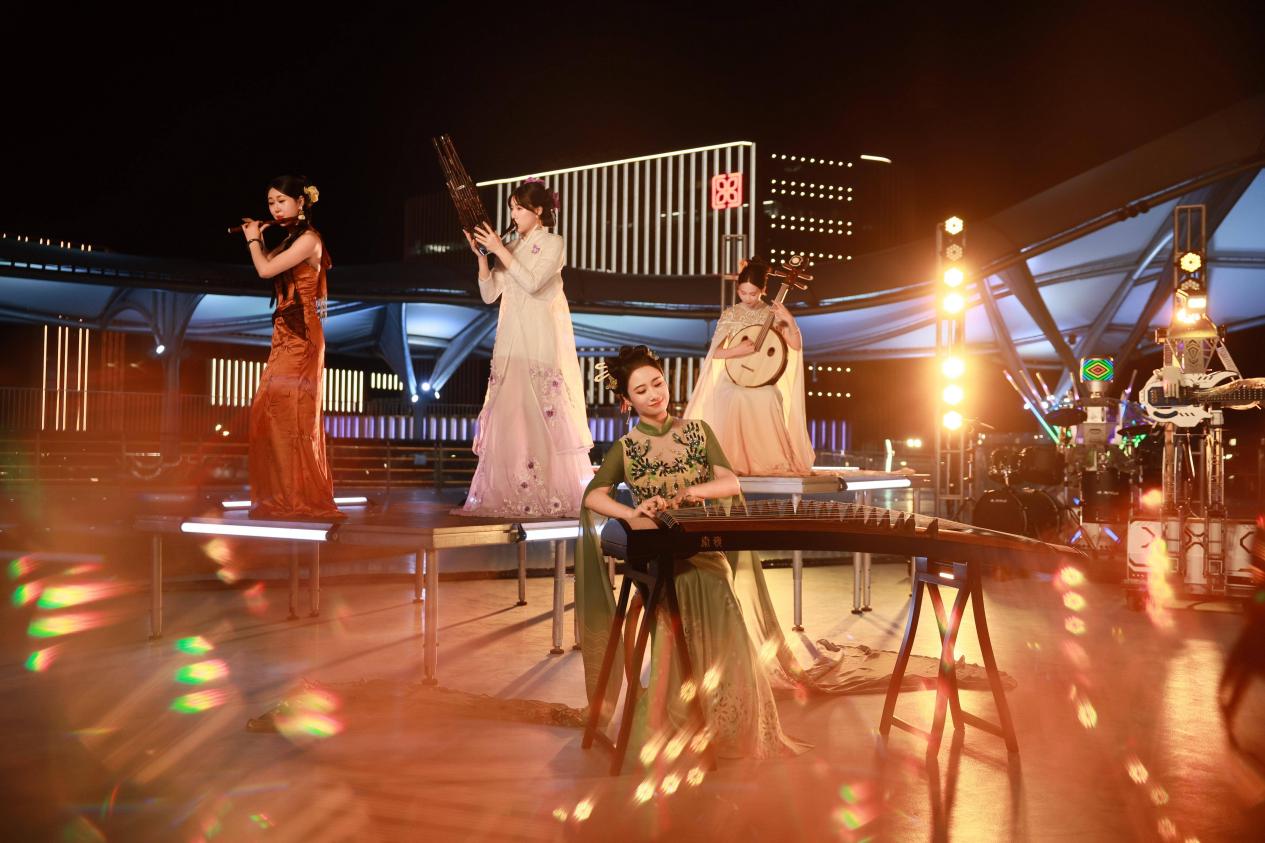 《仙乐来临》里,艺术家与机器人乐队齐鸣,滴水湖上“七星伴月”,呈现出一番壮阔唯美的景象。