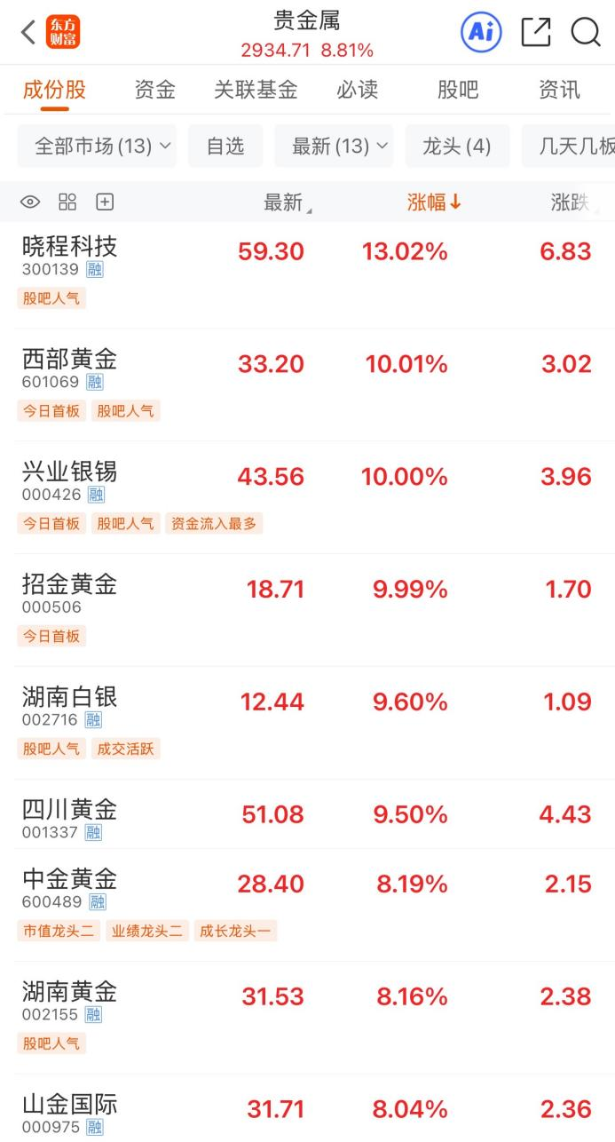 4月8日早盘,贵金属行业高开高走领涨A股行业板块,截至早间收盘,板块暴涨8.81%。个股方面,晓程科技涨超13%,西部黄金、兴业银锡、招金黄金涨停,湖南白银、四川黄金涨超9%,中金黄金、湖南黄金、山金国际涨超8%,盛达资源、赤峰黄金、山东黄金、恒邦股份等均涨超6%。