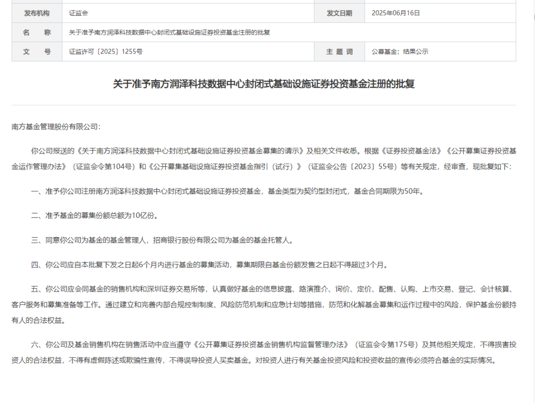 批复公告显示,南方润泽科技REIT的募集份额总额为10亿份,合同期限为50年。