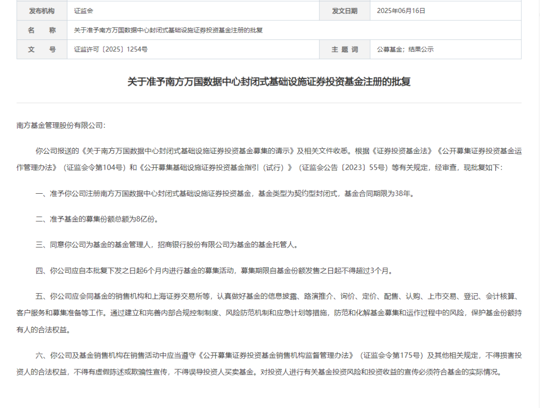 批复公告显示,南方万国数据中心REIT基金合同期限为50年,准予基金的募集份额总额为8亿份。南方基金为基金的基金管理人,招商银行为基金的基金托管人。