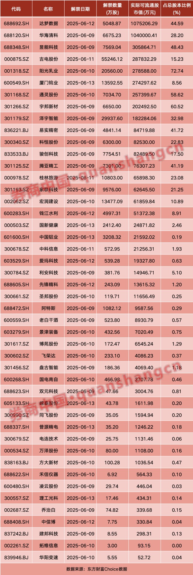 数据显示,本周(6月9日—6月13日)共有46家公司限售股陆续解禁,合计解禁22.85亿股,按最新收盘价计算,解禁总市值为465.63亿元。