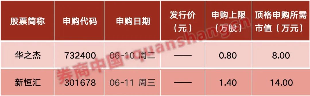 本周(6月9日—6月13日)有2只新股发行。周二:华之杰;周三:新恒汇。