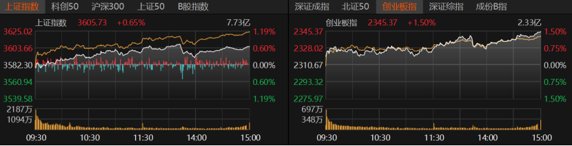 沪指收涨0.65%报3605.73点,创业板指收涨1.5%报2345.37点,深证成指收涨1.21%。科创50、北证50涨幅均超过1%,沪深300、上证50均收涨。