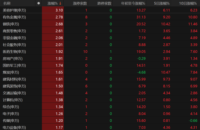 31个申万一级行业板块中,有28个板块飘红,其中美容护理涨幅超过3%,拉芳家化涨停;有色金属、钢铁、商贸零售、非银金融、社会服务板块涨逾2%,盛新锂能、中科三环、西藏矿业、永杉锂业、中钨高新等8只有色金属个股涨停,包钢股份、海南矿业、中国中免、海德股份、锦龙股份、西藏旅游、凯撒旅业也纷纷涨停。