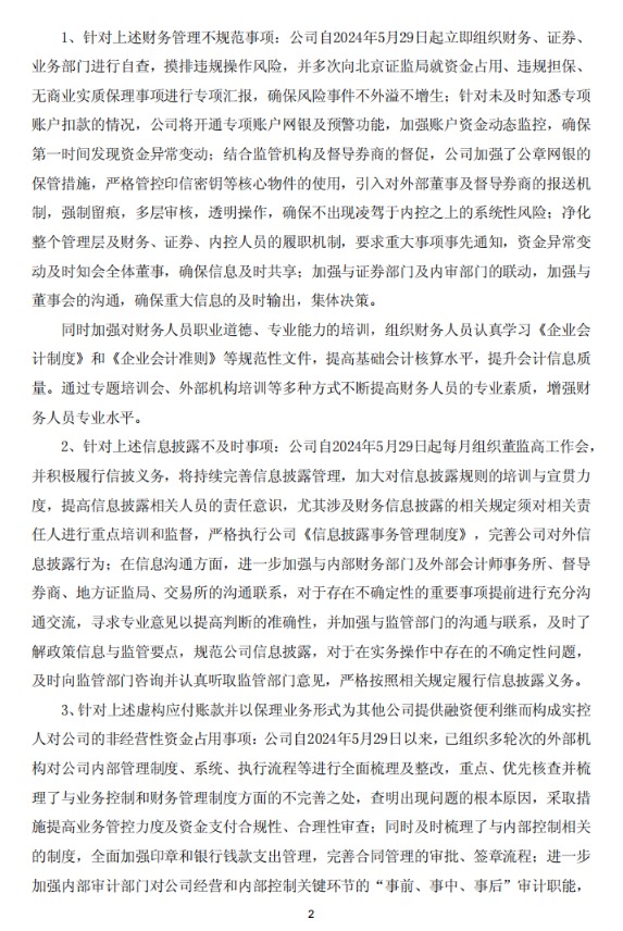 《整改报告》指出,问题一是公司虚构应付账款并以保理业务形式为其他公司提供融资便利,导致2024年12月至2025年4月银行扣划公司账户资金14251.47万元,实际控制人高明自认构成其对公司的非经营性资金占用,至今未偿还余额9694.72万元。