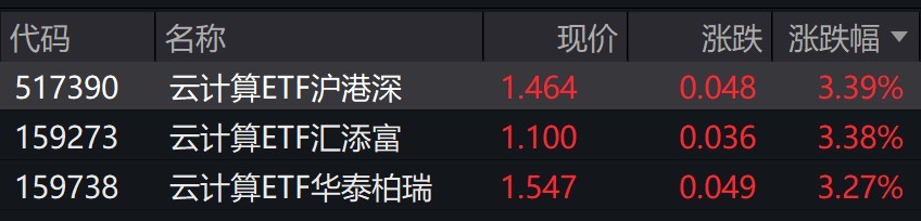 受盘面影响,跟踪中证沪港深云计算产业指数的ETF涨超3%。