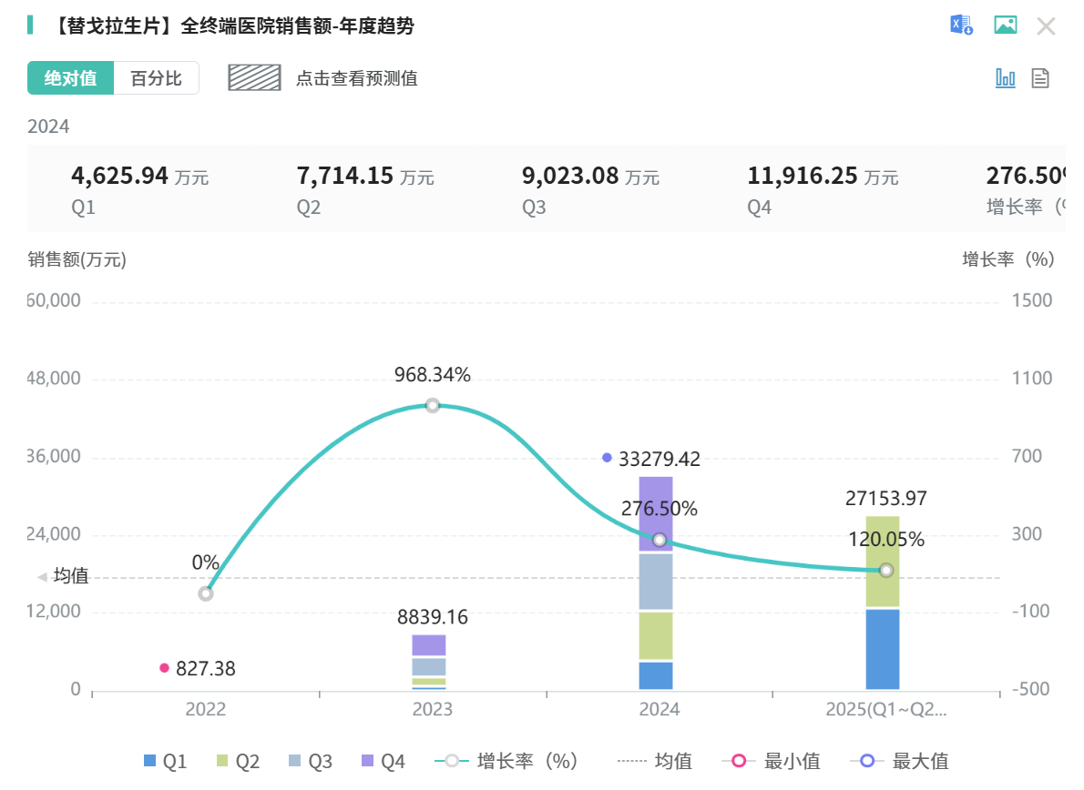 不过,据摩熵·医药数据库,替戈拉生片(泰欣赞®)近些年的销售额呈现逐渐走高的态势。2023年和2024年,该产品全年的医院销售额为0.8亿元、3.3亿元,今年上半年,产品的销售额已突破2.7亿元。