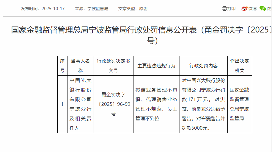 具体来看,光大银行宁波分行因存在授信业务管理不审慎、代理销售业务管理不规范、员工管理不到位3项违法违规行为,被国家金融监督管理总局宁波监管局对该分行处以罚款171万元,同时对洪某、俞某龙分别给予警告处罚,并对崔某给予警告并罚款5000元。