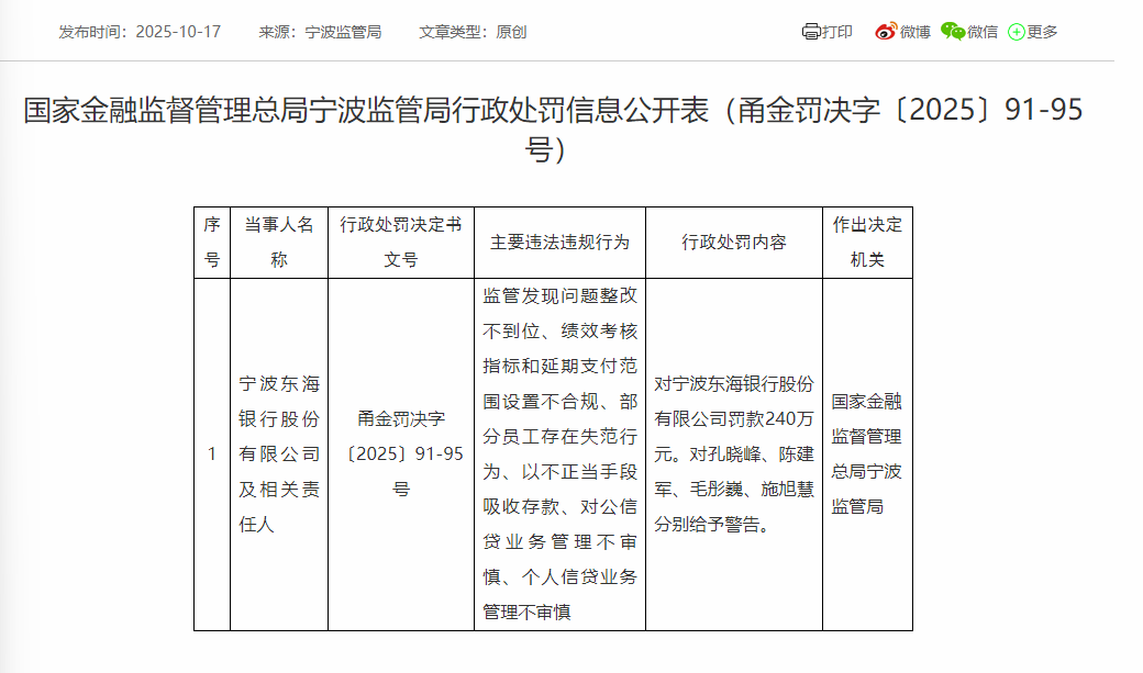 国家金融监督管理总局宁波监管局表示,鉴于上述违法违规事实,对宁波东海银行罚款240万元,并对孔某峰、陈某军、毛某巍、施某慧分别给予警告处罚。
