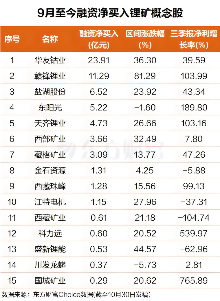 具体来看,华友钴业排名第一,融资净买入24亿元,9月以来涨幅超36%;千亿市值的龙头股赣锋锂业融资净买入超11亿元,9月以来涨幅超81%。