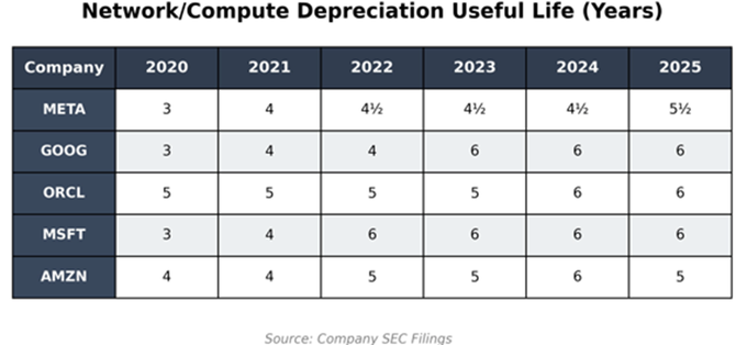 伯里在帖文中附带了一张表格图片。该图片显示,近五年Meta、谷歌、甲骨文、微软和亚马逊都调高了网络设备或计算设备的使用年限,其中Meta的资产寿命从2020年的3年增加到2025年的5年半,谷歌和微软则从3年增至6年。