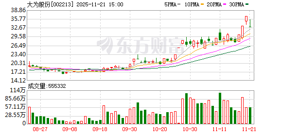 近期,大为股份在资本市场表现引人瞩目。据统计,近一个月内(2025年10月22日至11月21日),该公司股价累计涨幅达51.01%,远超市场平均水平。本轮行情中,该股出现多轮非连续涨停,先后于10月27日至28日、11月18日至20日收获两连板与三连板,市场情绪持续高涨。不过在11月21日,其股价触及跌停,显示出由情绪与资金博弈推动的波动特征。